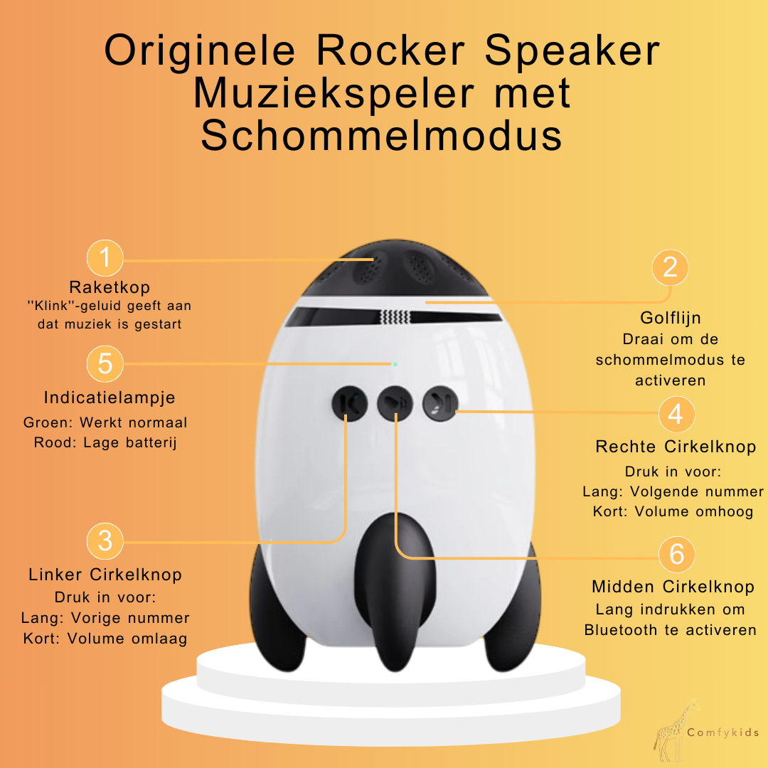 Met één simpele draaiknop schakel je het toestel in en pas je de wiegkracht aan. Je kiest tussen de rustgevende ingebouwde geluiden of koppelt via Bluetooth jouw eigen afspeellijsten. De rocker is fluisterstil en zorgt voor een gelijkmatig wiegtempo waardoor je baby zich veilig en geborgen voelt.