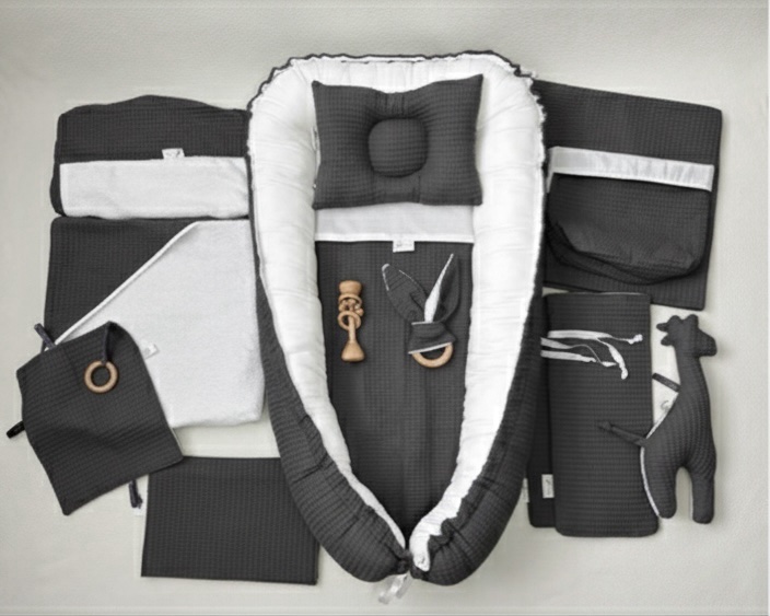 Met deze babynest set van wafelkatoen in donkergrijs kies je voor kwaliteit, comfort en een stijlvolle uitstraling. Alles wat je nodig hebt voor een warme en liefdevolle start voor je baby, overzichtelijk in één complete set.
