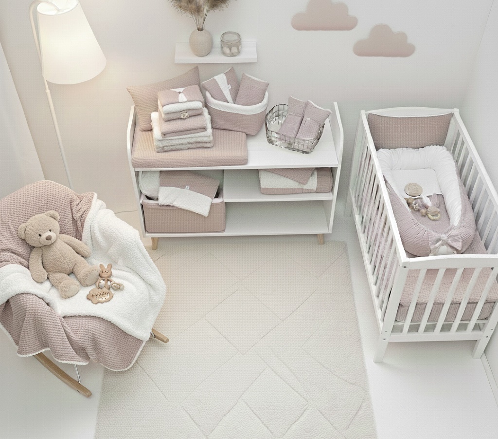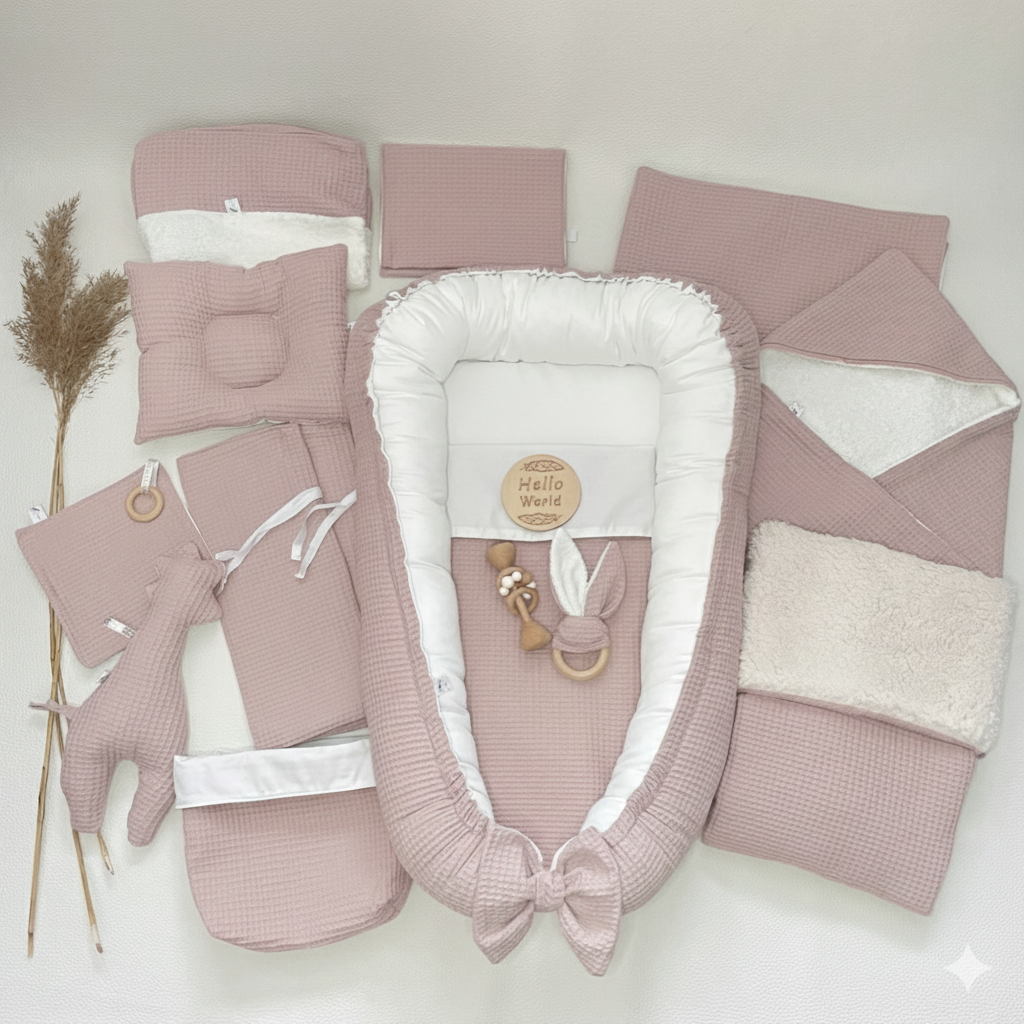 Met deze babynest set van wafelkatoen in oudroze kies je voor kwaliteit, comfort en een stijlvolle uitstraling. Alles wat je nodig hebt voor een warme en liefdevolle start voor je baby, overzichtelijk in één complete set.